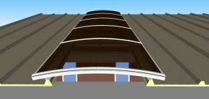 Trata-se de uma claraboia de Policarbonato em combinação com um telhado de Telha Termoacustica ISOETE – utilizando os perfis de aluminio PC5512 curvados – da Polysolution