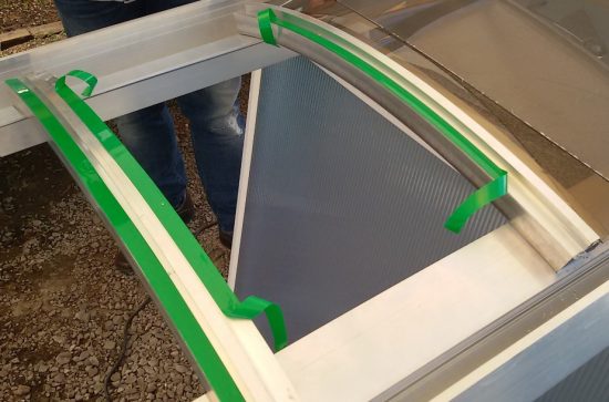 Policarbonato Compacto transparente Norma NR 12 para Proteção de maquinas e equipamentos Polysolution – abaixo um esquema de montagem do Policarbonato em seus perfis de fixação em aluminio , com acessórios de fixação e vedação como parafusos, fita dupla face VHB, Perfil Trapézio em aluminio 50 mm e perfil estrutural eem Aluminio
